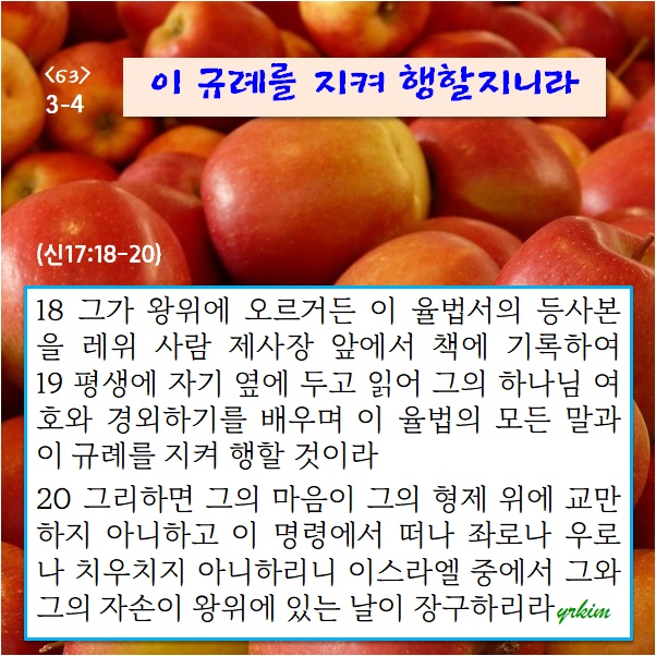 18 그가 왕위에 오르거든 이 율법서의 등사본을 레위 사람 제사장 앞에서 책에 기록하여 19 평생에 자기 옆에 두고 읽어 그의 하나님 여호와 경외하기를 배우며 이 율법의 모든 말과 이 규례를 지켜 행할 것이라 20 그리하면 그의 마음이 그의 형제 위에 교만하지 아니하고 이 명령에서 떠나 좌로나 우로나 치우치지 아니하리니 이스라엘 중에서 그와 그의 자손이 왕위에 있는 날이 장구하리라 (신 17:18-20)